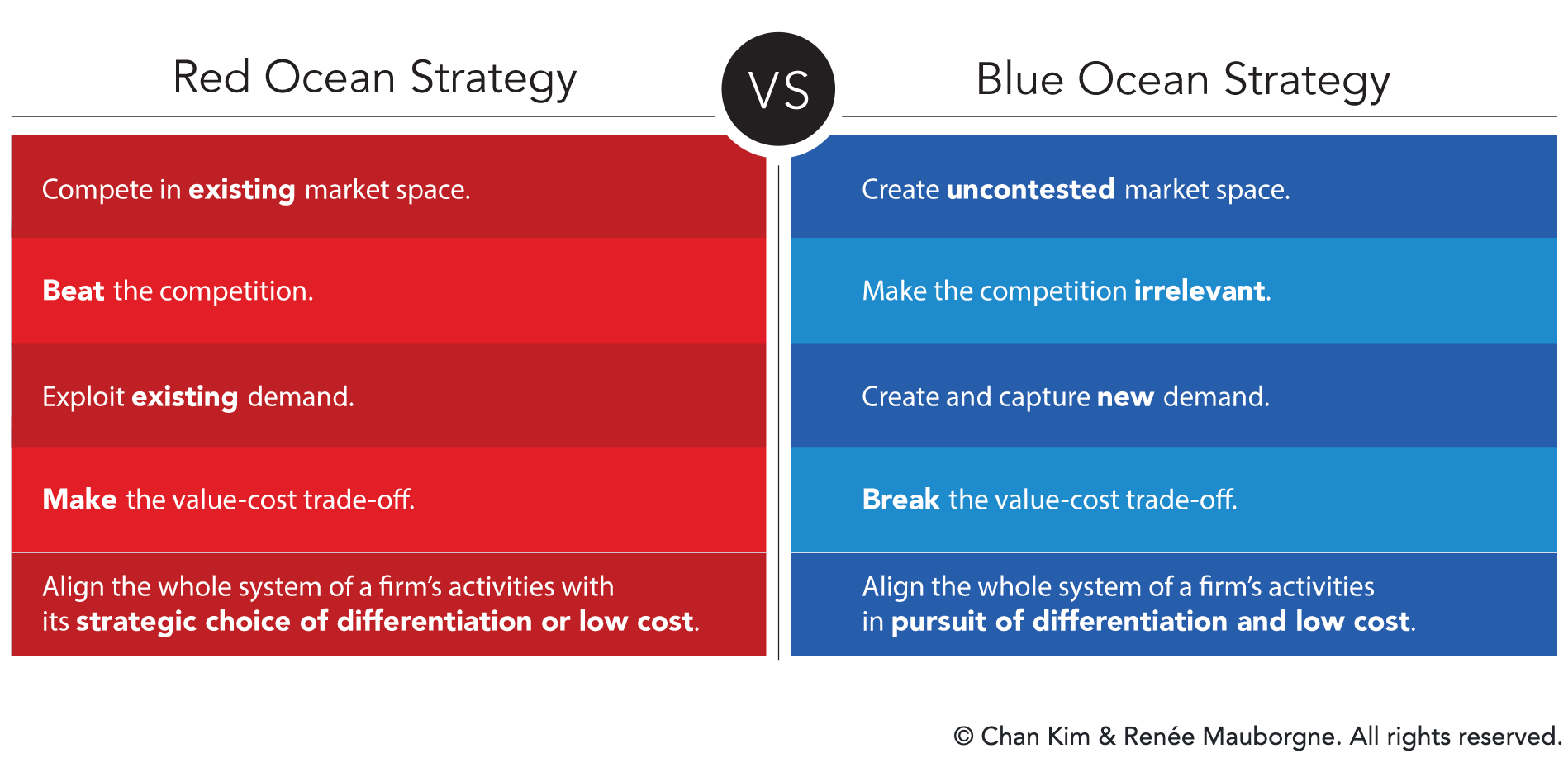 Dans un océan bleu, au contraire, vous êtes le seul sur votre bateau avec personne à perte de vue. Dans cet océan inconnu (donc marché non affecté par la concurrence), la demande est créée plutôt que conquise et la compétition n'existe pas (encore) car les règles du jeu n'existent pas (encore). Vous l’aurez compris, l'océan bleu est une analogie pour décrire l'immensité du potentiel non exploré.