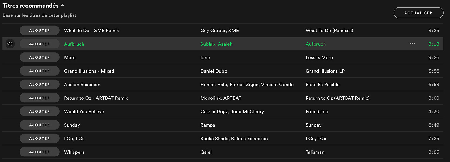 Take playlists, for example. Have you ever tried to create your playlist on Spotify? The 'recommended tracks' feature (below) is disconcertingly effective... As soon as you've put 5 or 10 tracks on your playlist, Spotify will put tracks you should like. And frankly, it never misses!